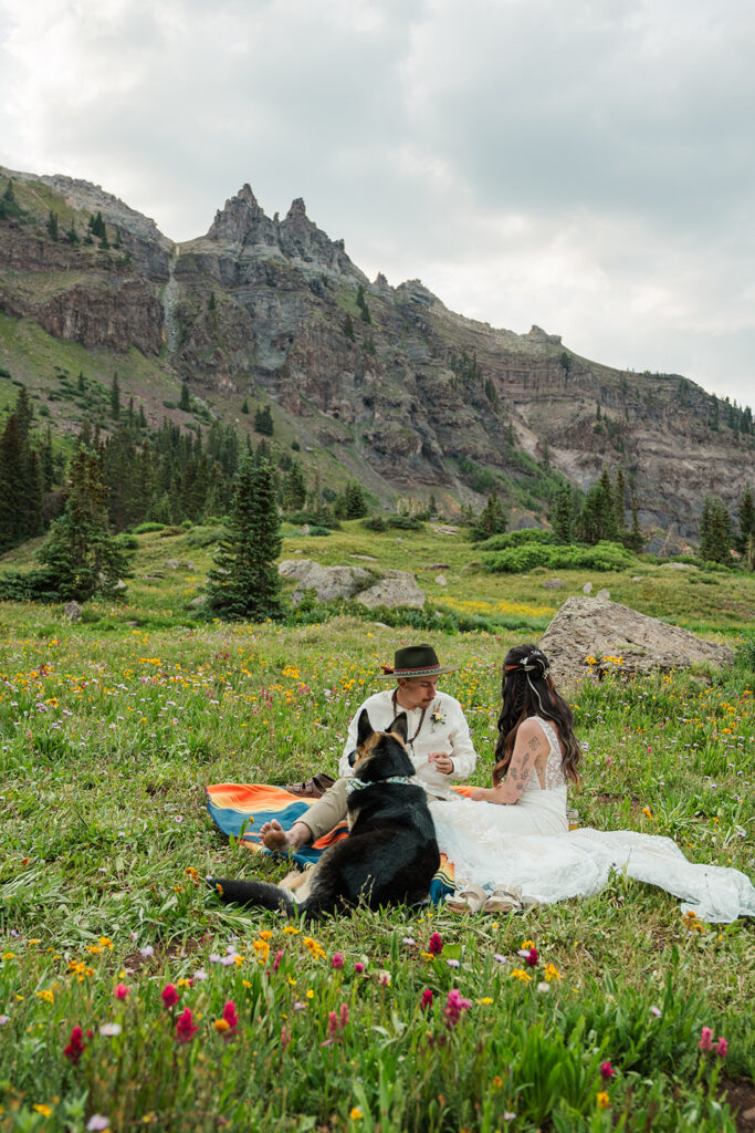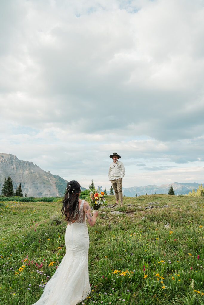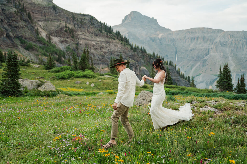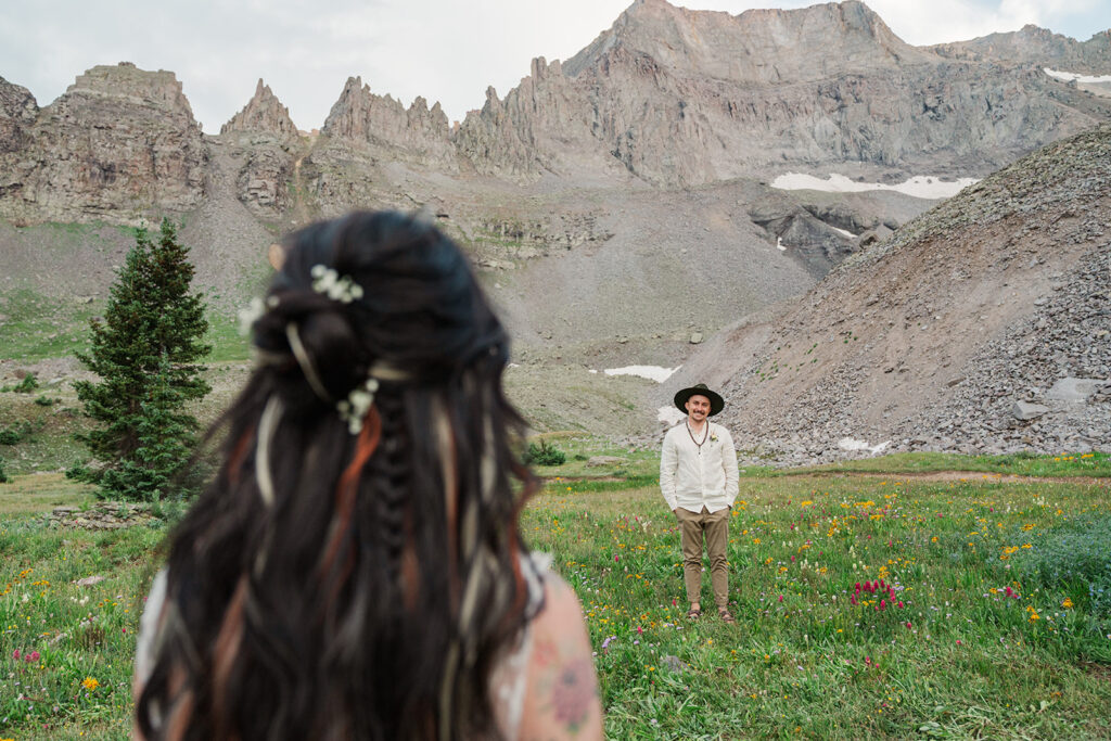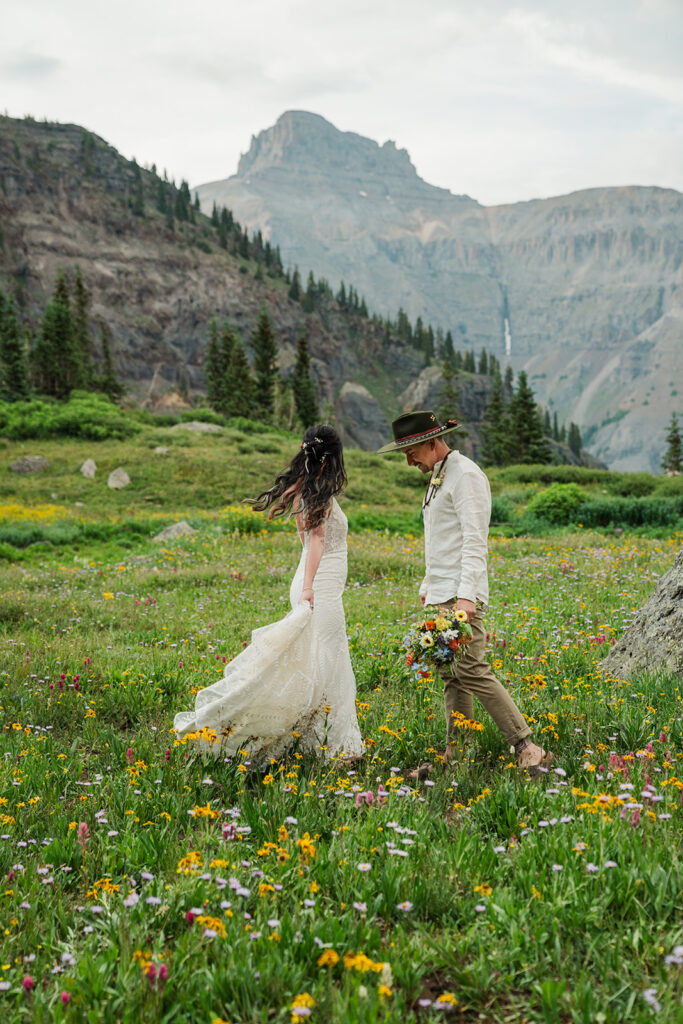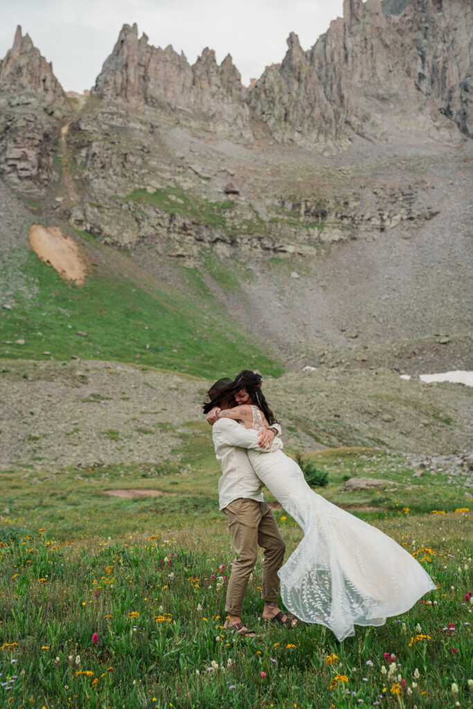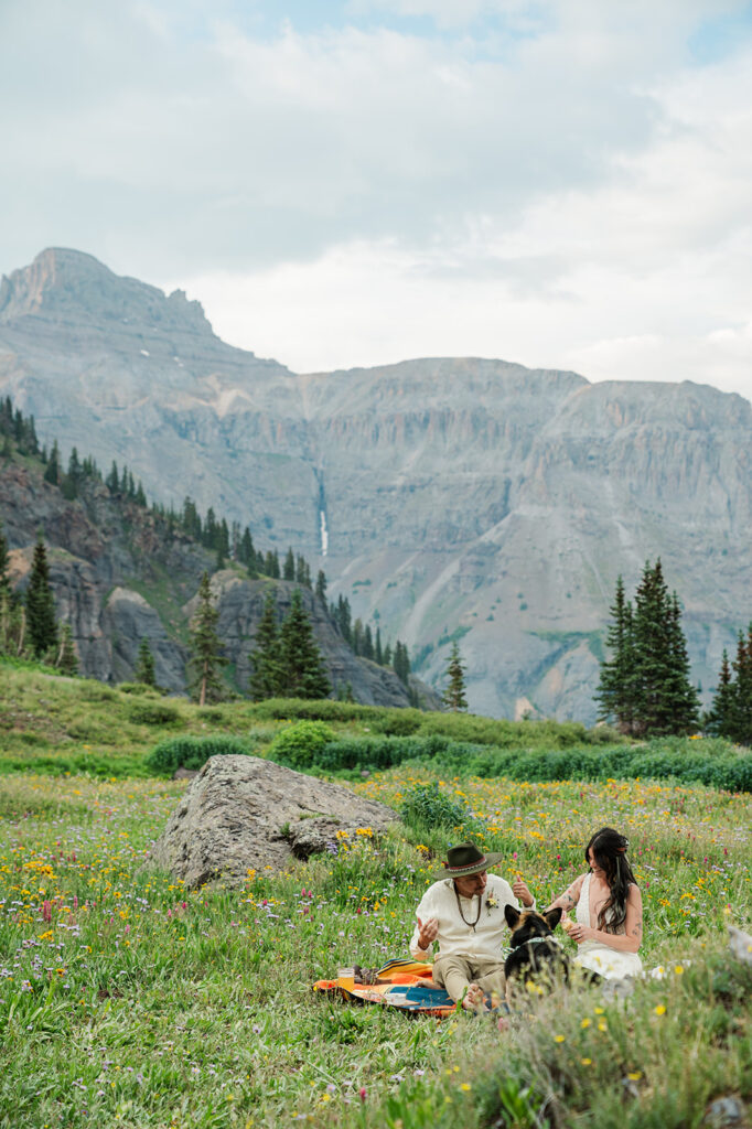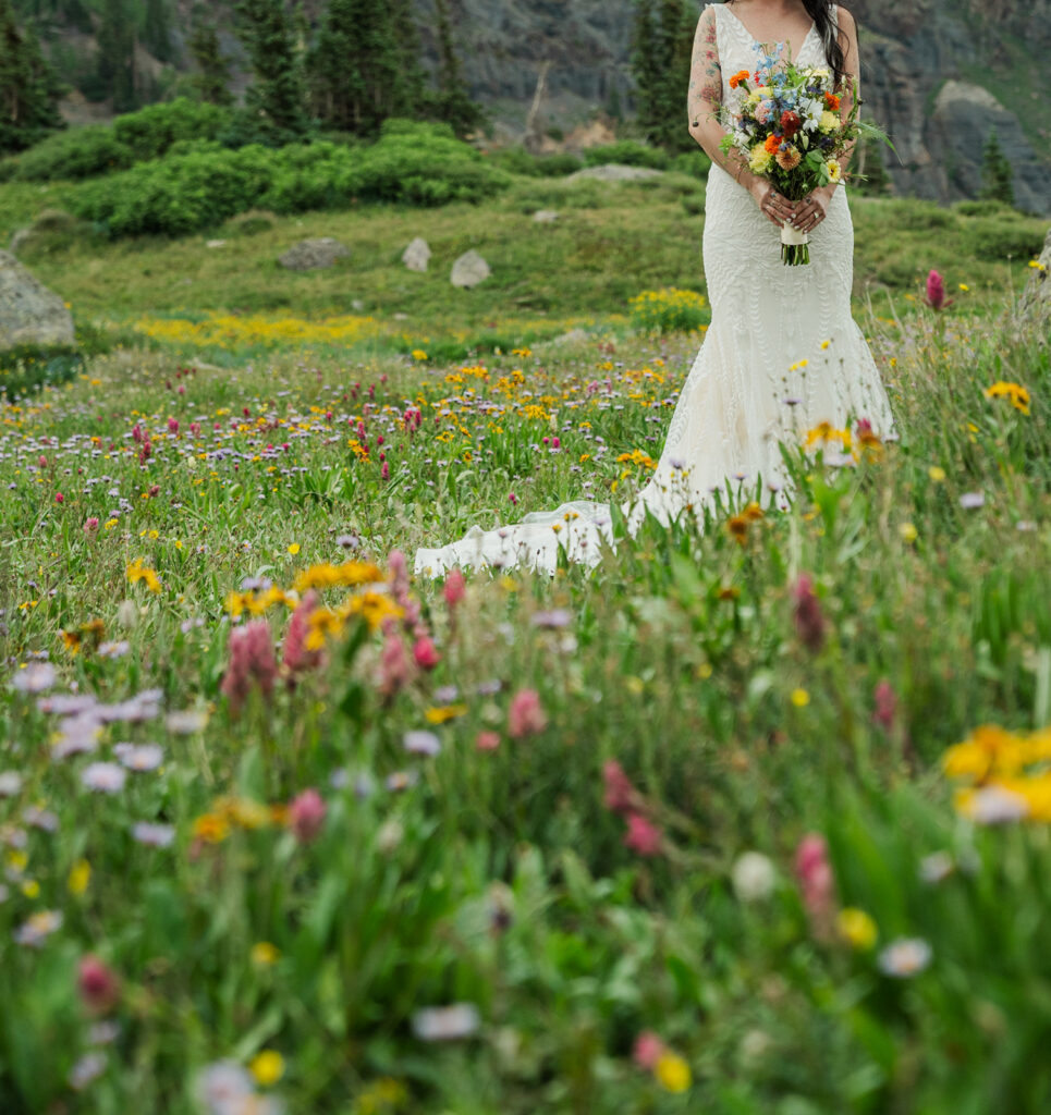 A summer magic day in Ouray, Colorado. Big Mountain views, fields of wildflowers in all the brightest colors, and privacy. Those things are hard to come by, especially in Colorado in July, but Sarrah and Clay found them. They wanted to prioritize their date around the new moon, and it just so happened to fall on the perfect day for wildflowers.